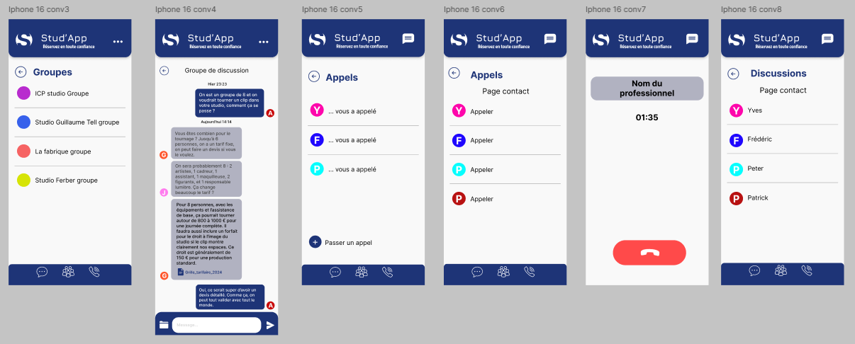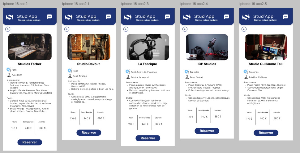 Maquette fonctionnelle d'une application mobile permettant de réserver un studio de musique — projet en groupe (2 semaines) : design et prototypage.